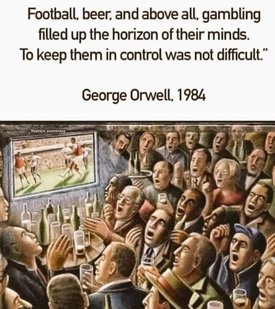 ジョージ・オーウェル『1984年』に描きだされる様々な場面は、今そのもの。「きつい肉体労働、家庭と子供の世話、隣人とのつまらぬいざこざ、映画、サッカー*、ビール、そして何よりもギャンブル。それが彼らの心を占める全てである」(早川書房新訳版111頁)。